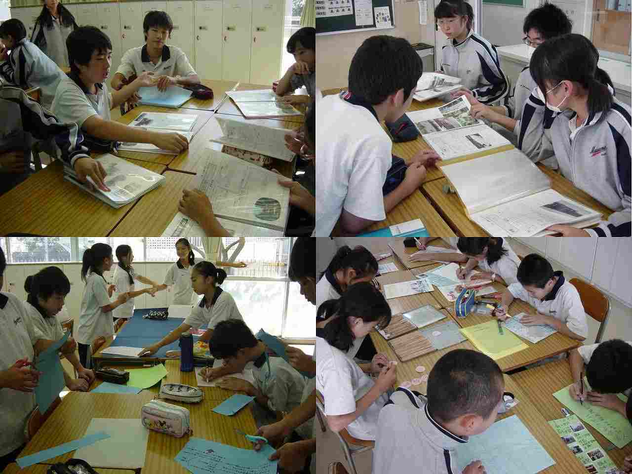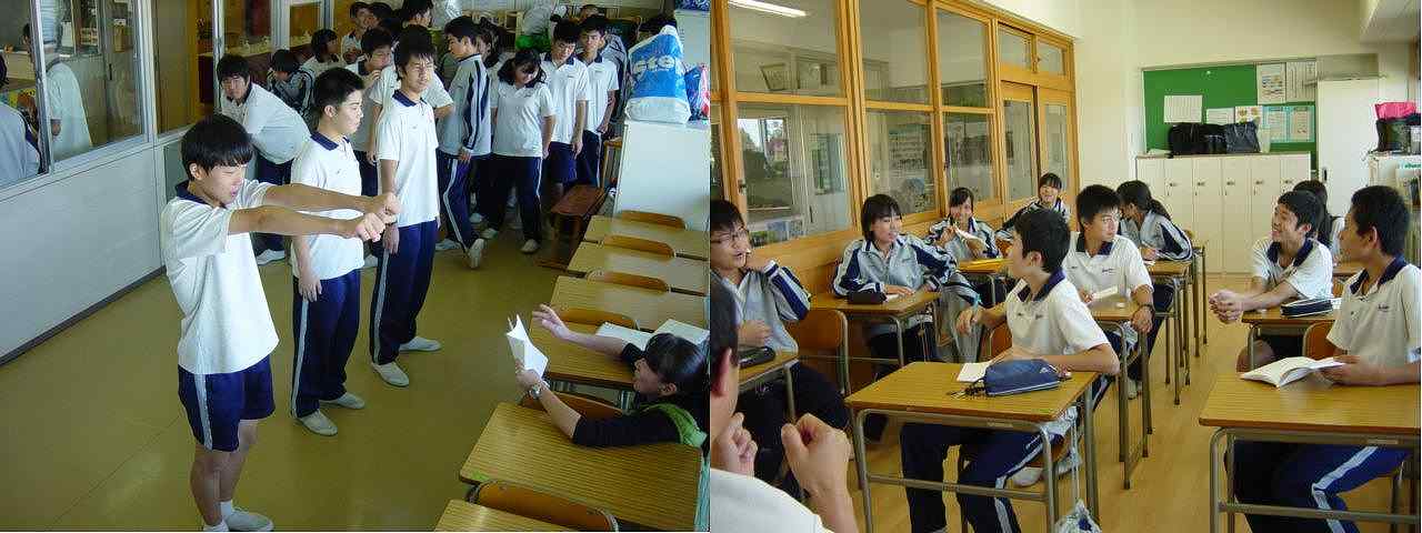 1・2年AB組 展示作業 | 3年AB組 模擬店運営準備 | 3年CDE組の劇練習と大道具係りの3AB生徒 | |