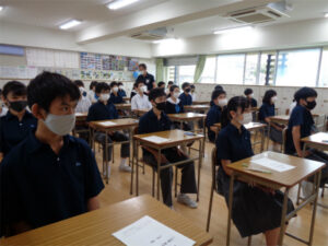 1学期末の総合テストが行われています。休憩後次のテスト問題が配布されている2年生の様子です。ピリッとした空気の中、集中力を高めています。さて出来は?
