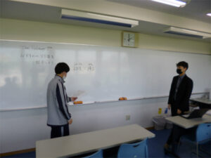 英語EEコースの授業では、新しいALTのエリック先生に、生徒からそれぞれのおすすめの日本語を英語で紹介しました。「おもてなし」「もしもし」などの日本語特有のことばや「すみません」「やばい」「へぇ~」など言い方や場面によって意味が変わることばなど使用例を交えながら、既習の文法を使ってしっかりと伝えていました。日本語を勉強中のエリック先生もメモをとりながら楽しんでいる様子でした。