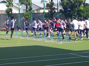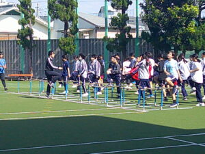 本校では、教科の枠にとらわれない教科横断型の授業を「コラボ授業」と称してカリキュラムに組み込んでいます。今回は1年生の授業で、体育と音楽がコラボし授業を行いました。テーマは「リズムに乗って走る」で、色々なテンポの曲を流し、そのリズムで速く走るための動きづくりやスキップを行うという内容です。