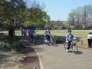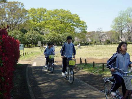 体験では2時間続きの授業で、実生活に必要な内容をCDE組合同で行います。買い物(スーパー、ファーストフード店)、公共施設(郵便局、プールなど)を利用することで公共の場でのルールやマナーを学ぶことが目標です。今年度最初の体験は、小金井公園でサイクリングを行いました。青空のもと、生徒たちはとても気持ちよさそうに吹き抜ける桜吹雪の季節を堪能していたようです。林間コースではお互いの間隔をとり、ブレーキ操作もしっかり行えていたので、今後もルールを守り安全に自転車に乗りましょう。サイクリングの後は皆それぞれ好きな飲み物を売店や自動販売機で購入し、ひと時の時間を友達と楽しんでいました。