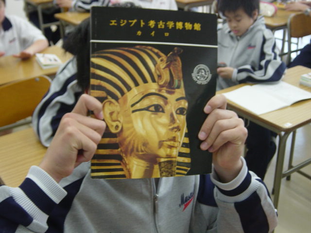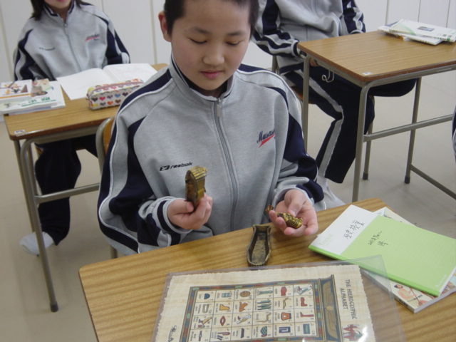 歴史の授業では『四大文明』について学習をしています。生徒たちはエジプトの工芸品やサハラ砂漠の砂、考古学博物館のパンフレットなどに興味を示し、それを実際に手でとって触れることで更にエジプトを実感していました。ヒエログリフ(象形文字)の読み方を教えたり、インダス文字が未解読であることを話したりするなど、歴史に対する関心を高める工夫を実践しています。