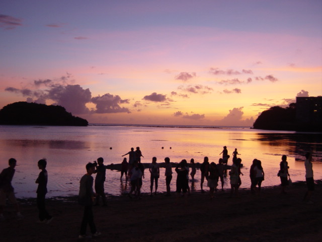 夕食の後は、浜辺に出て真っ赤な夕日を見ながら友達と遊びました。