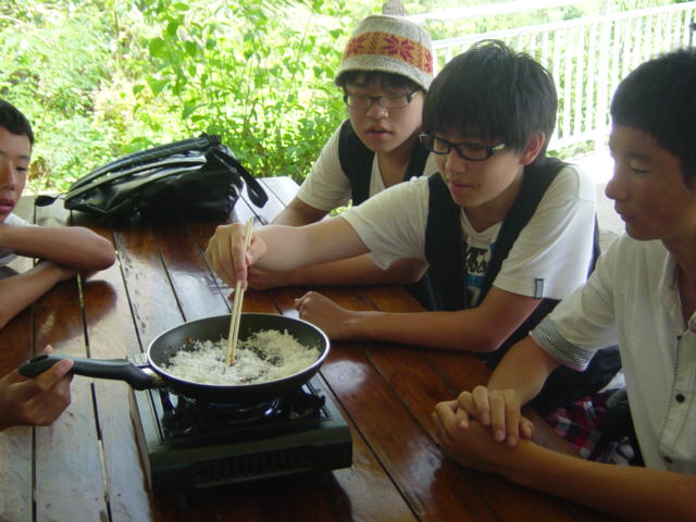 ヤシの実をほぐしてフライパンでかき混ぜ、途中で砂糖をまぶしながら作りました。僕たちの班は一番最初に出来て、さらに味も抜群でした。キャラメルポップコーンをちょっと焦がしているような感じでした。