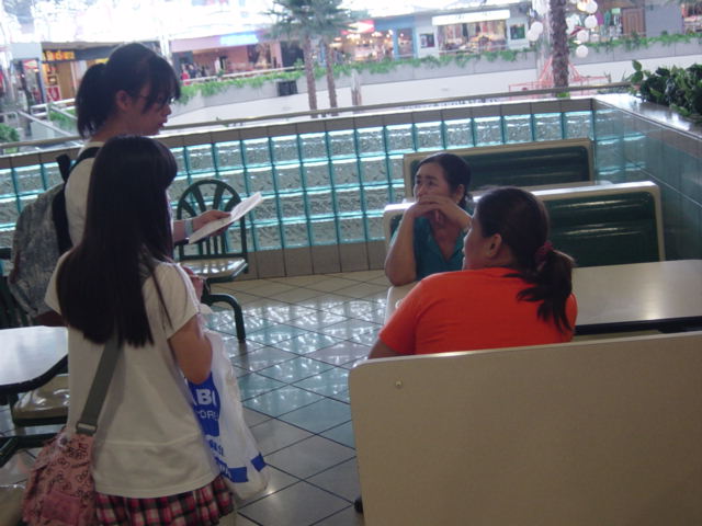私たちは今日、マイクロネシアモールで現地の人に質問をする企画で語学体験を行いました。今回は、東日本大震災のことについての自由質問と別に震災に関する質問もしました。皆はモール内を自由に散策して現地の人を見つけるとはじめは緊張している様子でしたが、徐々に笑顔で会話ができるようになりました。グアムの方々はとても気さくは方が多くいろいろな質問に答えてくれて、有意義な時間を過ごすことができました。とても貴重な体験になりました。