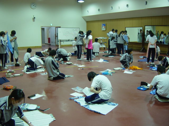 学園祭の模擬店でクラスユニフォームとしても使う、基礎縫い確認エプロンを制作しています。今回はそれぞれの体型や好みに合わせて丈を決め、布を裁つ工程です。丈の長さで大きく印象が変わるので、皆納得のいく作品になるよう何度も何度も鏡に向き合い丈の長さを考えていました。一人ひとりが広いスペースを使え、大きな鏡のあるアミティエホールで行った制作は、気分も変わりスムーズに作業を進められました。