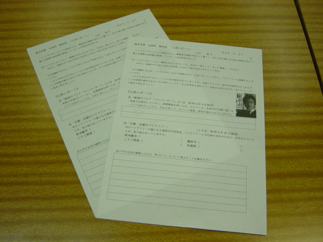 今日の生命科では、過去にTBSで放映された「乙武レポート」という番組を視聴し、前回学んだ「ノーマライゼーション」への考えを深めました。障害者にとって密室のバリアとなってしまっているエレベーターについてや、バリアフリー化が困難な京都・奈良の文化財など、さまざまな問題点や改善されてきた点を見つめ、真の意味での「みんな」の町づくりについて学ぶことができました。
