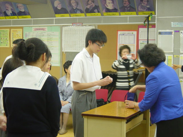 「Sクラブ」とは学校や地域に役立ちたいと考えている中学生や高校生のボランティアグループです。今日は後援をして頂いている女性の奉仕団体「ソロプチミスト武蔵野」の方々が来校され、バッチの授与をしていただきました。