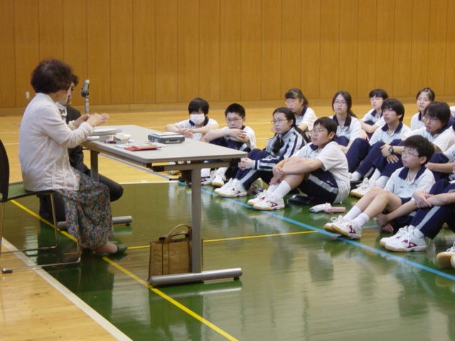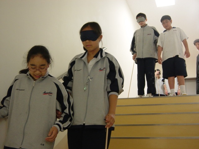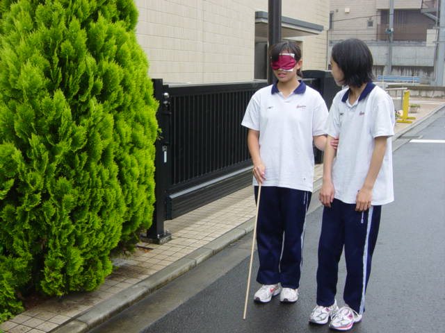 今回は、視覚障害者の方に来ていただき、講演をしていただきました。実際に使用している点字の本や新聞、携帯電話、音声機器なども見せていただきながら、「目が見えないとはどういうことか」「視覚障害者ができること」というお話を伺っています。できないことが多いのではという印象をもっていた生徒たちにとっては、自分たちと変わらない日常生活がむしろ驚きだったようです。その後、ガイドヘルパーの方に、視覚障害者をガイドする方法を教えていただき、アイマスク体験を行いました。生徒からは、「怖かった」「ガイドとの信頼関係が大切」「適切な声がけが必要」などの声が聞かれ、ガイドする側と、される側の両方を経験する、とても貴重な時間となっています。今後、街中で積極的にガイドする行動力につながっていくことでしょう。