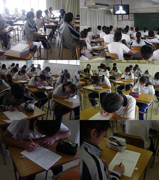 先週に続き、原爆に関する学習の2回目です。本日のビデオでは、原爆特有の威力であり、後の世代にも後遺症として影響を与える放射線について詳しく学びました。また広島市立第一高等女学校の生徒544人が全滅した話と、その遺品(下駄の片方、弁当箱など)のエピソードは、生徒の心に深く刻み込まれたようです。原爆についての学習は今後、国語の授業教材でも取り上げ、より深い理解を目指していきます。