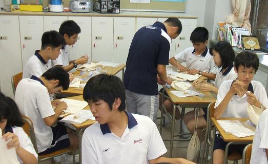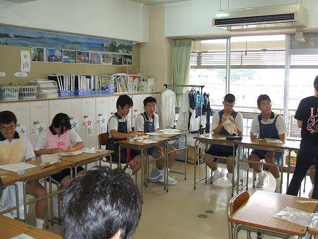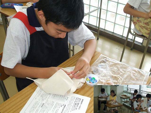 今日の実習は、被服「トートバックの絞り染め」です。家庭科室でビー玉、おはじき、割り箸、たこ糸等を使用した色々な絞り方のオリエンテーションを受けてから、各クラスに分かれてバックのデザイン決めをしました。皆、説明を良く聞いていたので手際よく作業を進めることができていました。
