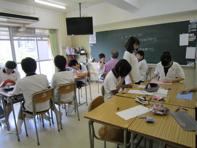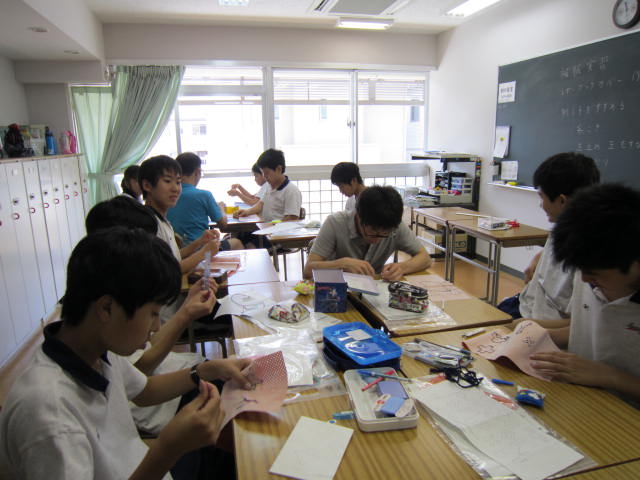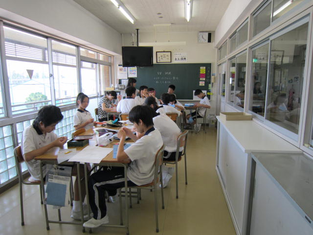 実習被服では「レザーのブックカバー」の製作中です。一人ひとりが図案を考え、刺し子で模様を作っていきます。完成にはまだ時間がかかりますが、全員が集中して作業を進めています。