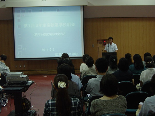 7月2日(土)、3学年AB組保護者対象の進学説明会を行いました。はじめに教頭から進学全般に関わる説明や、進路選択に向けた心構え等について話があり、その後進路指導主任から入試制度や受験のシミュレーションについて説明がありました。