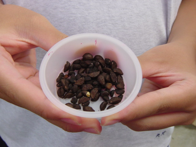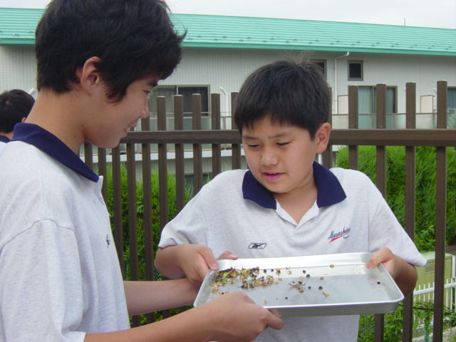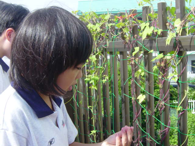 「植物の栽培」の学習として育てていた朝顔。夏の間、紫色の花をたくさん咲かせていました。今日は、学習のまとめとして、花のあとにできている種を取り、プランターやネットを片付けました。種を蒔き、また種を取るまでの過程を身近に見ることで、植物への観察眼が磨かれ、興味が高まったようです。