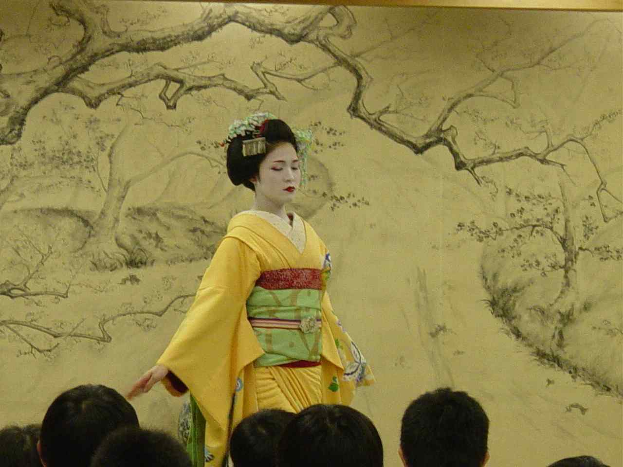 2日目の夜には、宿に舞妓さんに来て頂いて、舞いを観賞したり、舞妓さんに関してのお話を伺ったりすることができました。舞妓さんが舞う姿や身につけている着物や帯、お化粧も美しかったのですが、一瞬見ただけで思わず引きつけられるオーラも感じられました。