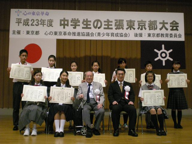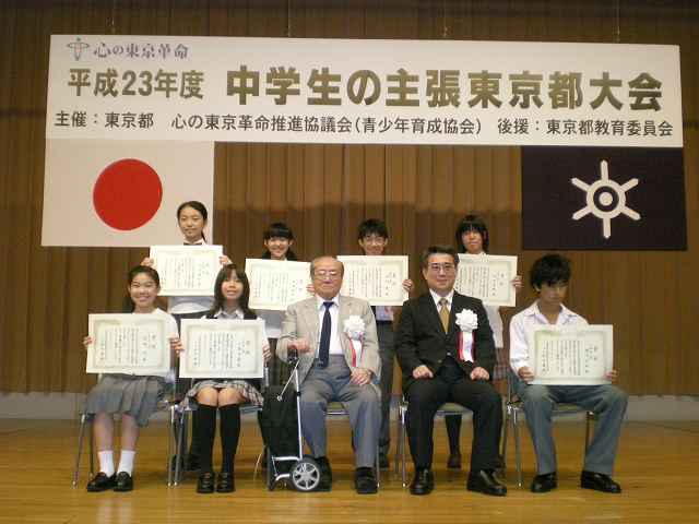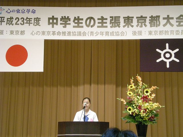 9月11日(日)、東京都庁第一本庁舎5階「大会議場」にて平成23年度「中学生の主張東京都大会」が開催されました。本校からは3名が入賞し、うち1名は発表者の10名に選ばれて自らの主張をスピーチしました。どの発表も内容・態度ともに非常に立派で、本校生徒もたいへんよい刺激を受けたようです。受賞生徒と作文の題名は以下の通りです。