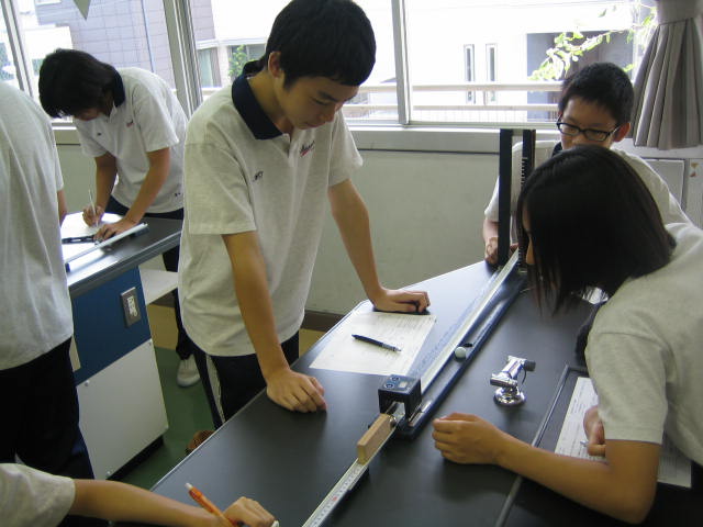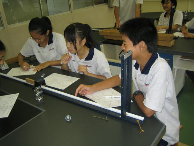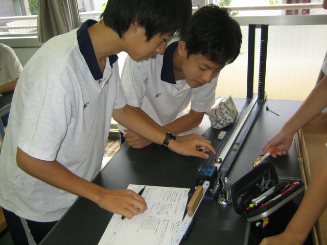 3年生物理分野の学習もいよいよ大詰めを迎えようとしています。位置エネルギーと運動エネルギーは物体の何とどのように関係しているのだろうかと投げかけ、それを実験によって確かめます。高さ、速さ、そして質量が関係しているだろうと推測をした上で、それぞれに条件を変化させ、エネルギーとの間にどのような関係があるのかを真剣な表情で調べていました。