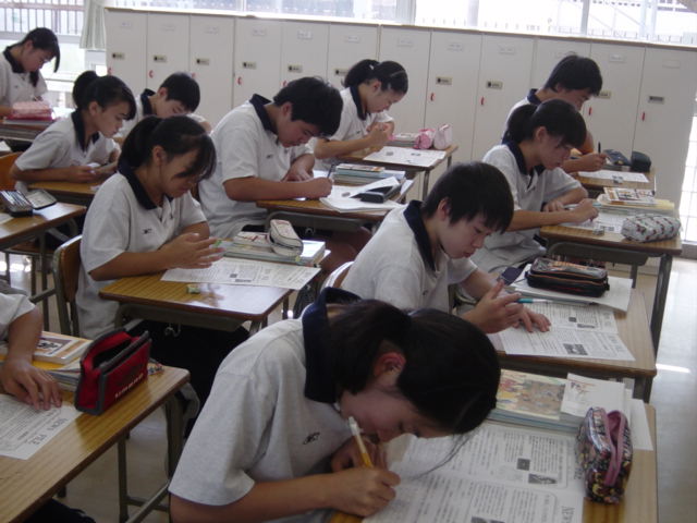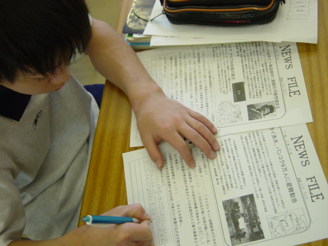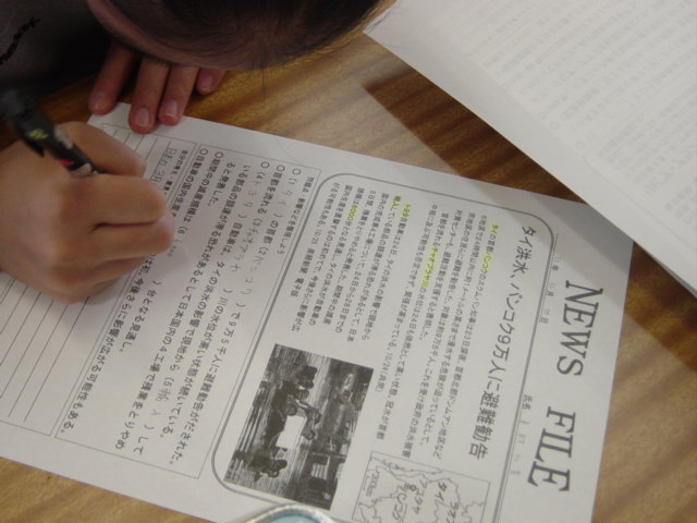 「NEWS FILE」とは、世界や日本のニュースに関心を持ち自分の意見を持つことを目的として、1~3学年AB組の社会科で実施しているものです。今日の授業では、リビア情勢とタイの洪水被害についての新聞記事を題材にして、それぞれの出来事から発生する影響や問題点を書き出しました。国の位置といった地理的な理解を深めるとともに、自分の考えをまとめるよい機会となっています。