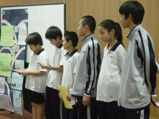 本日の生命科では、これまで進めてきた学園研究のまとめとして、AB組合同の「プレゼンテーション」を行いました。学園の歴史や創立者について調べたことをグループごとに発表します。1年生にとっては慣れないプレゼンテーションでしたが、各自が自分の分担をしっかりと発表することができました。お互いの発表を聞いて、学園に対する理解がより深まったと思います。学園祭まであと10日、展示物も完成間近です。