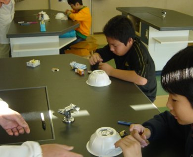 今日の理科実験は、「ホバークラフト作り」でした。ホバークラフトは水陸両用で使われている乗り物です。モーターとプロペラを使い、空気の流れを起こし、発砲スチロールの容器(カップめんの入れ物)を浮かせます。電池のスイッチを入れると机上に置いた容器と机の表面の隙間から風が出て容器が動きだしました。小学生のみんなもびっくりです。今年度の理科実験はこれで最後ですが、また来年も楽しいものを企画しますので楽しみにしていてください。