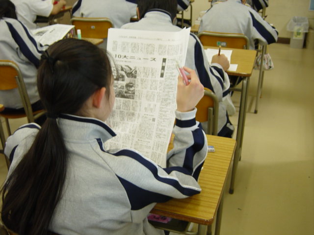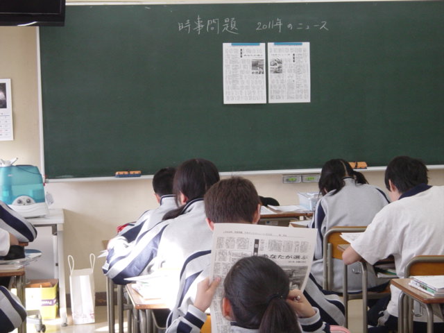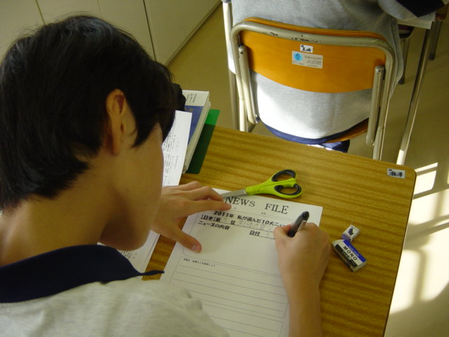 社会科の授業では、4月から時事問題について自分の意見をまとめる『NEWS FILE』に取り組んでいます。今日は新聞記事を利用して日本と海外に関する2011年のニュースを振り返り、「今年の10大ニュース」を選びました。生徒たちは意欲的に新聞に目を通し、今年の出来事を振り返っていました。集計したものは、後日発表する予定です。また、自分にとってのナンバーワンニュースを選び、問題点をまとめて意見を書く作業も行いました。このような企画を通して、生徒たちは今まで以上に時事問題に対する関心を高めていきます。
