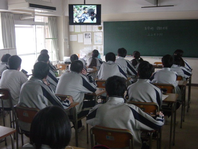今回は、「世界の12歳」というユニセフのビデオを視聴し、世界のいろいろな地域の子どもたちの暮らしを学びました。日本に住む自分たちと世界の同年代の子どもたちを比較し、異なる点を見つけて、理解しています。その後ユニセフの各機関や、国際会議で採決された「ミレニアム開発目標」についても学び、世界の目指すべき方向を再確認しました。