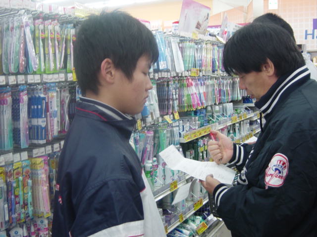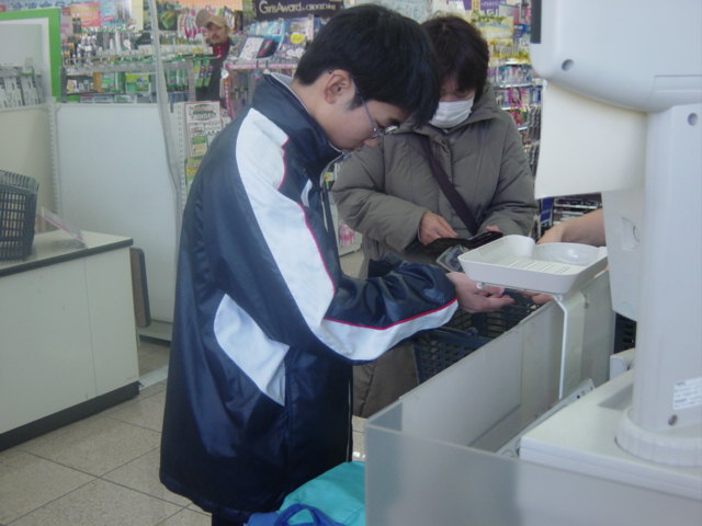 今回の体験は近隣のドラッグストアでの買い物実習です。家庭から持ってきた買い物リストを見ながら、それぞれ商品を見つけ出すことが今回のポイントでした。レジで買い物袋の要・不要もはっきりと伝えられるようになったことは今までの練習の成果でしょう。