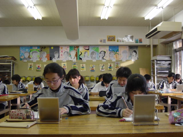 先週まで、2回の授業で取り組んだクリスマスカードは各教室で展示され、教室を華やかに彩っていました。2学期最後となる今日の授業では、3年生にかけて継続して取り組む自画像に入りました。自画像では、苦手意識をもつ生徒も多くいるので、一つひとつのパーツを描いてみたり、短時間でささっと描いてみることなどからスタートしています。描き始めると、時間を忘れて鏡に写る自分とじっくりと向き合い、集中して取り組む姿が見られました。