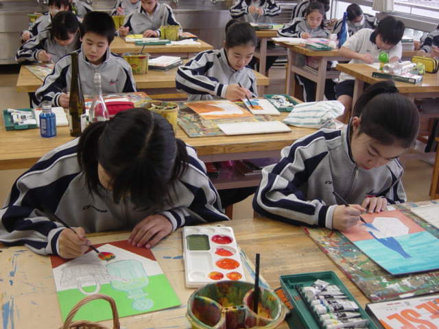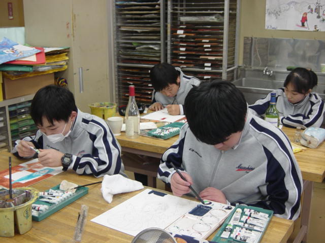 本日は、2学期までに下描きを終えていた「静物画」の着彩に入りました。モチーフを机の上に置き、絵の具を混ぜながら少しでも実際の色に近づくように取り組む姿が見られました。水の量や、塗り重ねなど制作のなかで経験を積み、仕上げていきたいと思います。
