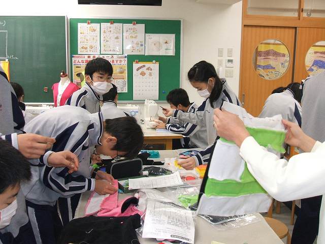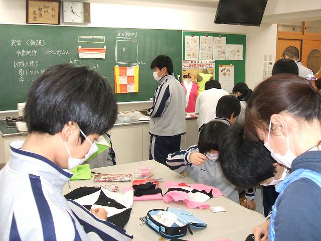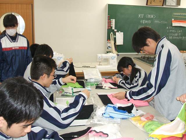 卒業制作の「コーディネイトクッション」作りも3週目に入り、授業の前に作業台の準備やミシンのセッテイングを自主的に行う生徒が多くなりました。各自のデザインに合わせたしつけ縫いから、ミシンの本縫いへ一人ひとり黙々と真剣に取り組んでいます。また、個性あふれる色とりどりな作品の完成が楽しみです。