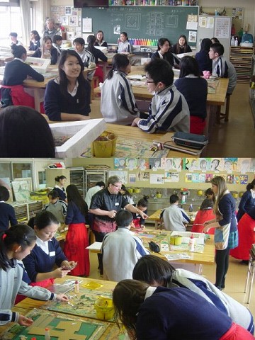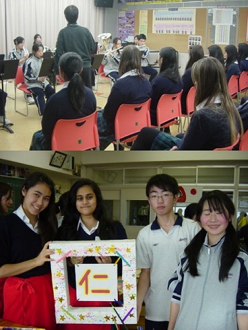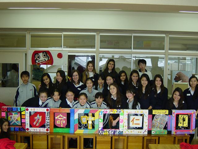 本日、聖心インターナショナルの生徒16名が来校し、中学校の生徒13名をあわせた29名で、美術の交流授業を行いました。今回は『8Blocks(がんばろう日本!)』というテーマのもと、8グループに分かれて漢字1つを中心に掲げ、思い思いにブロックを装飾していきます。生徒は言葉こそ違うもののお互いにしっかりコミュニケーションをとり、すぐにうち解けて作業をしていました。アイディアは次々とうまれ、完成された作品は独創的で素晴らしいものとなっています。また、お昼休みにはアトラクションとして、本校のダンス部による演技や吹奏楽部の演奏が行われました。