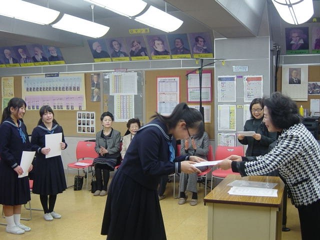 「Sクラブ」とは学校や地域に役立ちたいと考えている中学生や高校生のボランティアグループです。今日は後援をして頂いている女性の奉仕団体「ソロプチミスト武蔵野」の方々が来校され、表彰状を授与していただきました。