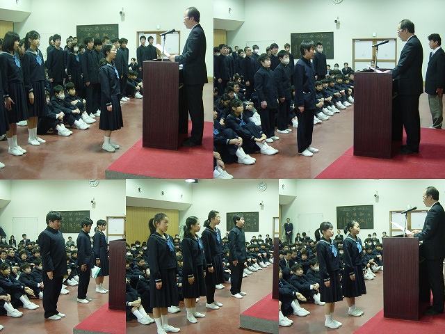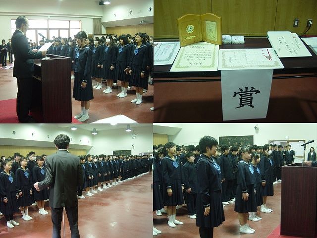 式のはじまる前に3年生を含めレシテーション・英検・漢検合格者が表彰を受けています。その後1・2年生のみ修了式が行われました。校長から今年度のまとめ、また次年度にむけての心構えについての話があり、続いて皆勤賞・精勤賞・一般賞・研究活動「優秀賞」・東京私学財団文科・スポーツ活動賞(女子体操競技部1年木村さん)と東京都体育協会「特別表彰」(女子体操競技部1年木村さん、中尾さん)等の表彰がありました。式後は友愛会主催の送別会が開かれ3年生と別れを惜しみ、クラスに戻ってから担任より一人ひとりに成績表が渡され下校となりました。
