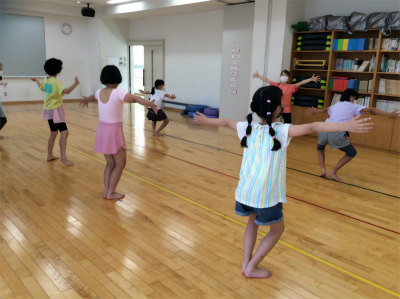 ダンス教室では、より大きく動く感覚を身につけるために、全身で文字を表現する「あいうえお体操」を行っています。